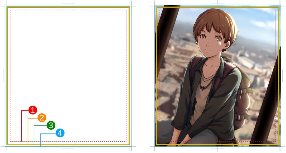 (1)文字切れ線 切れてはいけない文字やイラストは、線の内側に収めてください。 (2)フチ線 このラインから、フチのテープで図面が隠れます。(3)裁断線 裁断線でイラストはカットされます。 (4)塗り足し線 塗り足し線の枠まで必ず塗り足しをつけてください。